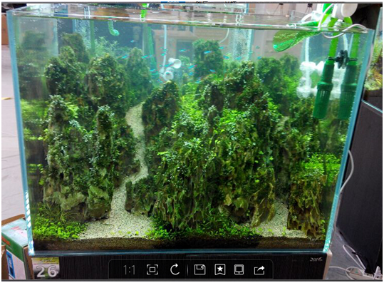 把層巒疊嶂的山峰搬進了缸里,再點綴上翠綠的水草, 這就是今年第二次在CIPS上舉辦的世界水草大師賽。水下造景為公認為是水下微縮園林,是目前正流行的休閑娛樂項目。本屆水草大師賽一共分為40組,共創作了40個水下微縮園林景觀。郎澤華是一位年輕的水景造型師,他的作品《 峭峰春榮》被評定為全場總冠軍。評委會對這件作品的點評是:缸中的石頭,按照由“近大遠小”原則,非常巧妙地組合在一起,營造出了很深的景深。同時,作者利用了很多的小素材,把很多細部做得非常的細致,尤其是前面的化妝紗鋪得很平整,讓人嘆為觀止。峭峰春榮 是一件用心、用智慧、用創意的偉大作品,是本次比賽當之無愧的全場總冠軍。